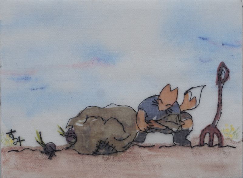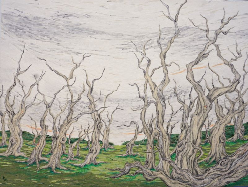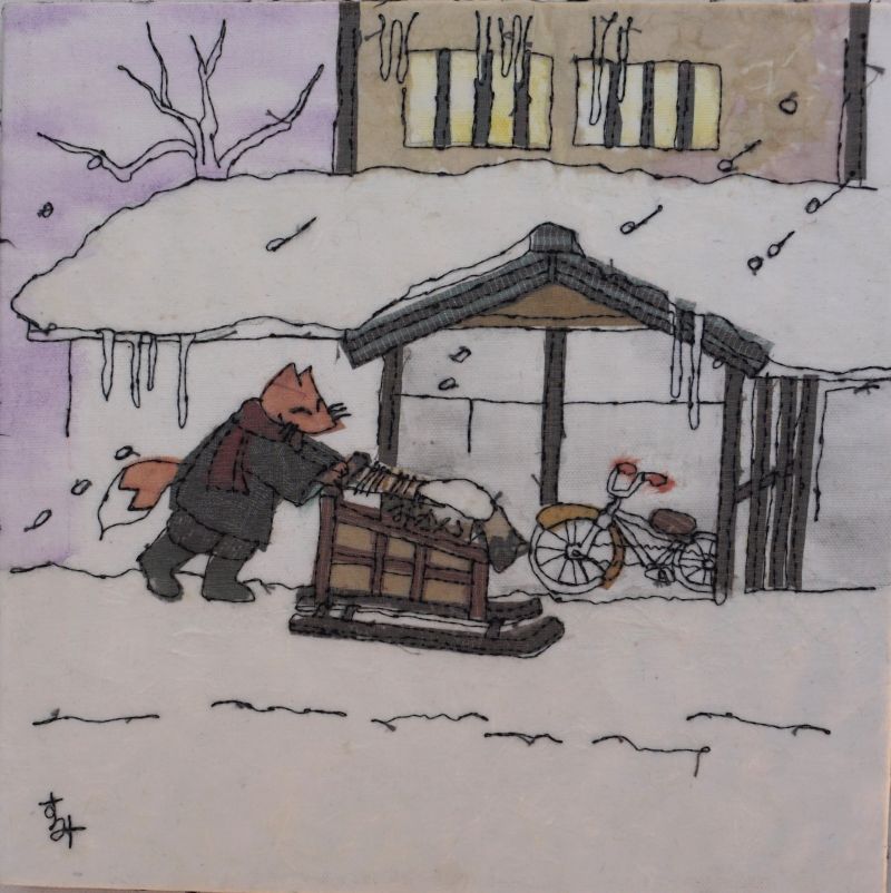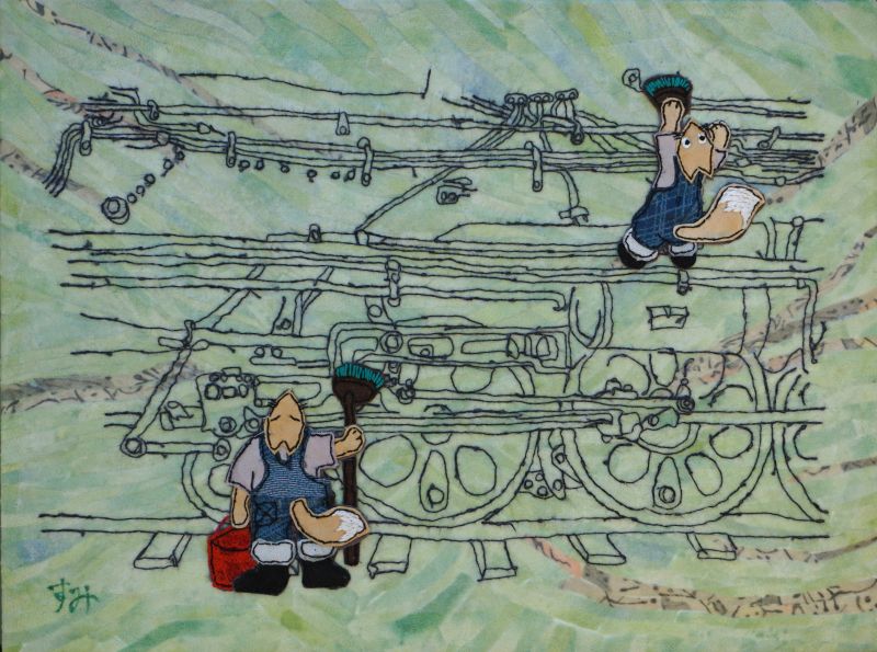 Sumi’s work is made of tiny pieces of kimono silk. Using “fabric as pigment” on canvas, she is creating pieces that look like paintings, until we get close enough to see the tiny pieces of silk. Recently she has also been weaving large bird’s nests and other art pieces out of natural materials she has collected.